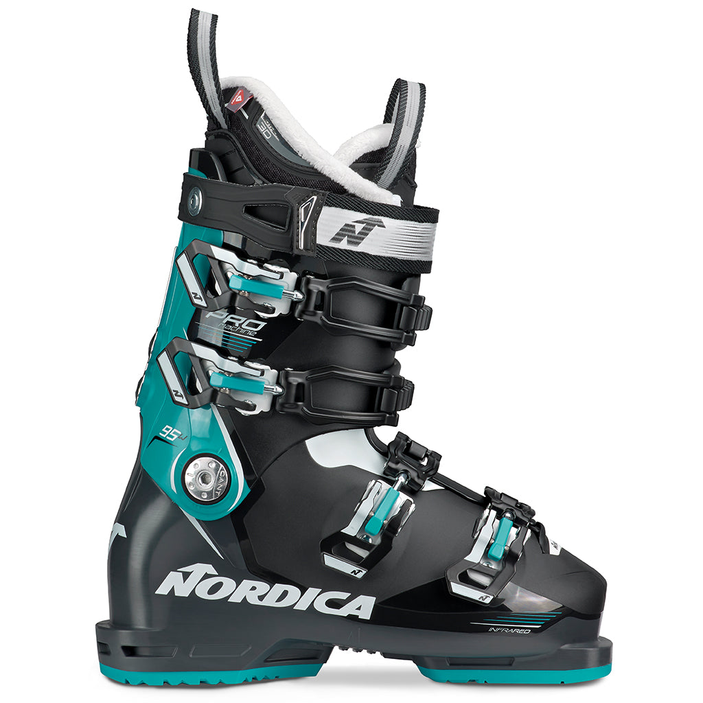 Thought an easy-flexing, high-performance boot with a perfect fit didn’t exist? Think again. The Promachine 95 is lightweight and low-volume, making it energetic and reactive and allowing it to perform well on groomed trails, in bumps, and through crud. It’s also extremely comfortable. Primaloft liner material and an articulated rear cuff, which allows for more calf space, provide a warm, plush feel, and a 98mm last shell and 3D liner, which can be customized using infrared heating, allow for an even more precise fit. Though soft flexing, the 95 utilizes stiffer plastic along the spine of the shell to create lateral stability and fast energy transfer, making it extremely quick and precise. The Promachine 95 is perfect for lighter women who ski with more finesse and want a boot that’s both forgiving and responsive.