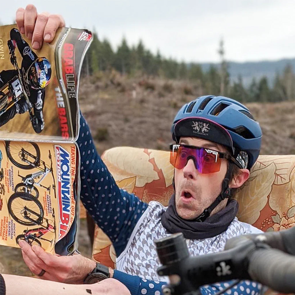 Doté d'un cadre noir lisse et probablement aérodynamique associé à une lentille ambre enduite de revo violet. Parfait pour parcourir les sentiers toute la journée, les bars toute la nuit et se réveiller dans le short boueux de quelqu'un d'autre.